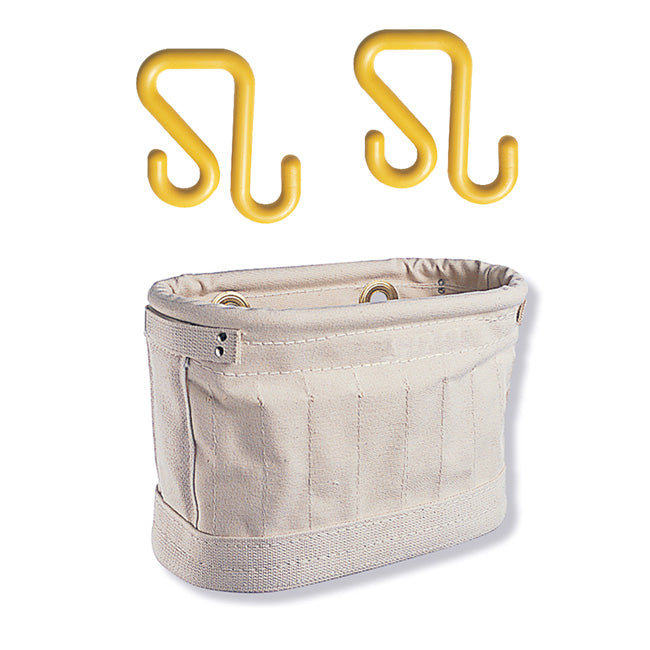 Jameson Canvas Tool Bag with Two S-Hooks has 15 inside pockets, 2 grommets for hooks, and two S Hooks (24-01). It can be mounted from the bucket using the included high strength, weather-resistant polymer S Hooks. Jameson canvas tool bags feature reinforced sides and base to prevent sagging or water retention.