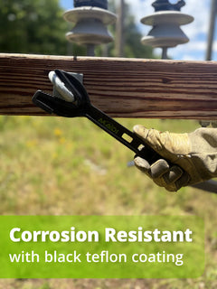 Crafted from forged steel with no moving parts, the Goat Wrench Plus offers long-lasting durability. A black Teflon coating adds corrosion resistance, and the integrated milled face hammer increases on-the-job functionality. At 12" long, it delivers the extra leverage linemen need, while weighing up to 13% less than comparable tools—helping reduce fatigue over time.