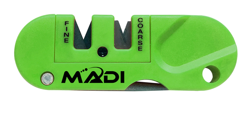 The MADI Pocket Knife Sharpener is a compact and highly efficient tool designed to keep your blades sharp and ready for action. Perfect for linemen, straight, serrated, and safety blades, this sharpener features preset sharpening angles that deliver consistent, reliable results every time. The carbide blades quickly set the edge, while the ceramic finishing slot refines the sharpness for a smooth, precise cut. For added versatility, the sharpener includes a fold-out diamond-coated, tapered rod ideal for serrations, standard edges, small hooks, and safety corners. With a convenient lanyard hole for easy attachment, this sharpener is incredibly portable, measuring just 3.5” long and 1” wide, and weighing only 1 ounce. It's packaged in an attractive countertop box, making it perfect for impulse sales, ensuring that no matter where you are, your blades stay in top condition.