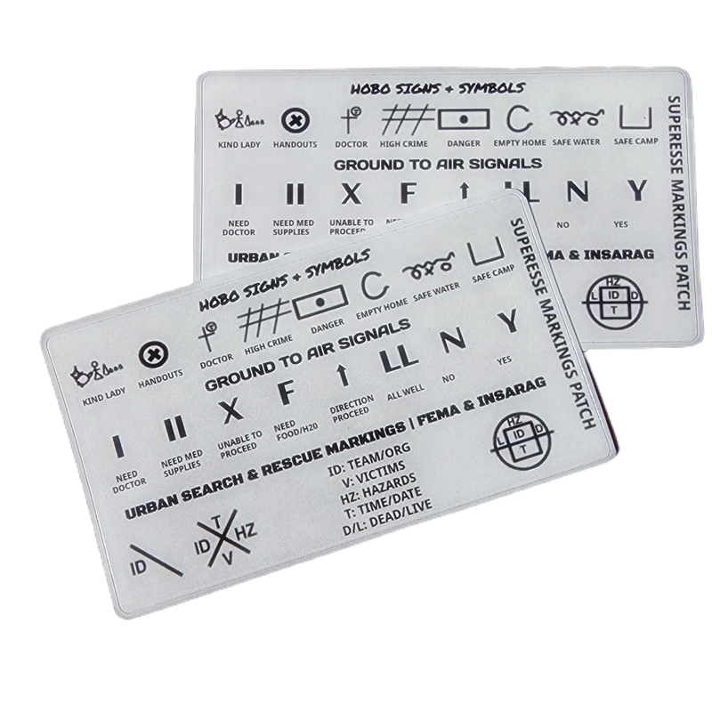 This decal contains useful symbols, signals, and markings to be referenced in survival scenarios. The Hobo Signs and Symbols are helpful to find medical aid, avoid dangerous areas, or find a safe place to shelter down for the night. The Ground to Air Signals can be used to summon rescue and assistance from above aircraft but could also be improvised in other messaging situations. The Urban Search and Rescue Markings can be interpreted to determine if the building is safe to enter (for shelter or scavenging of supplies).