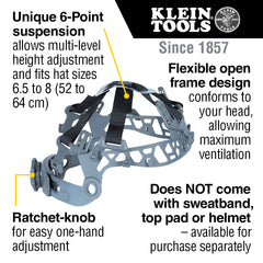 - Safety Helmet Suspension is for use with Klein Tools' Safety Helmets only (Cat. Nos. 60525, 60526, 60564, 60565, 60515, 60516, 60517, 60149, 60150)