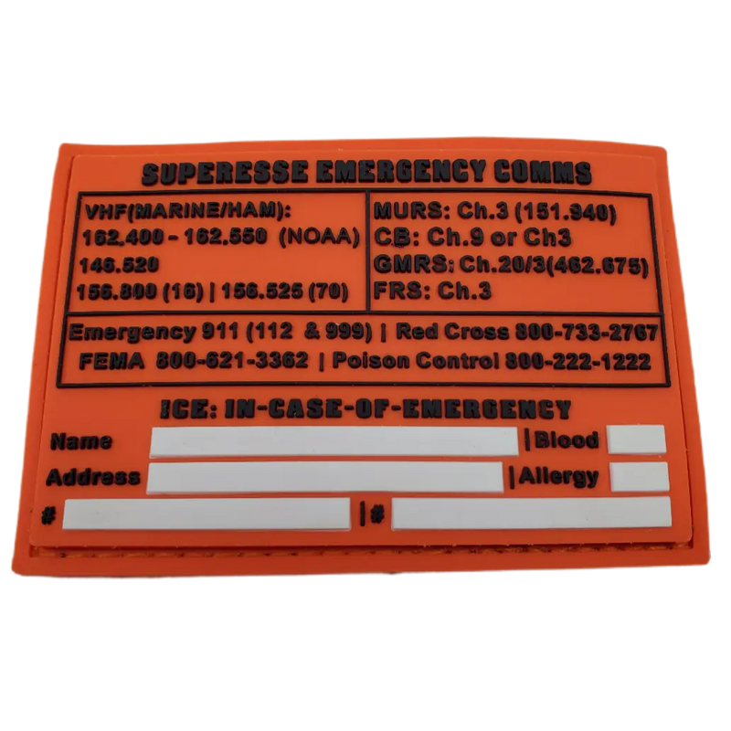 This patch is used as an emergency call book. Reference it to hail assistance on emergency radio frequencies and channels. 4 helpful contact telephone numbers are included in the event of an emergency. The lower half of the patch contains a fill-in-the-blank ICE (In-Case-of-Emergency) Card. This information is referred to by first responders in the event of an accident so that family can be contacted. It will also provide medical services with your blood type and known allergies.