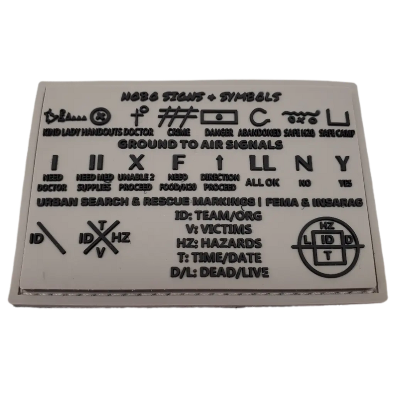 This patch contains useful symbols, signals, and markings to be referenced in survival scenarios. The Hobo Signs and Symbols are helpful to find medical aid, avoid dangerous areas, or find a safe place to shelter down for the night. The Ground to Air Signals can be used to summon rescue and assistance from passing aircraft but could also be improvised in other messaging situations. The Urban Search and Rescue Markings can be interpreted to determine if the building is safe to enter (for shelter or scavenging of supplies).