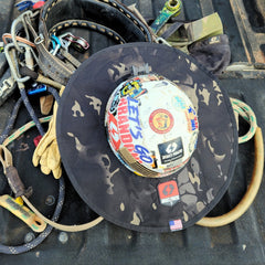 The fly shade is made from a neoprene material with elastic hooks on the inside to keep it attached to your fly hat while hanging under the helicopter..